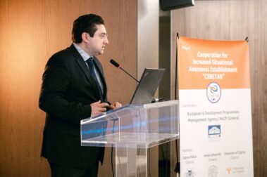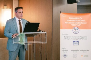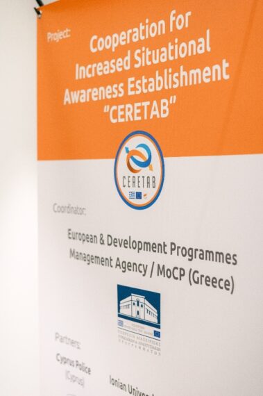 Την 25η Μαϊου 2023 η Υπηρεσία Διαχείρισης Ευρωπαϊκών και Αναπτυξιακών Προγραμμάτων (Υ.Δ.Ε.Α.Π.) διοργάνωσε την τελική συνάντηση επισκόπησης (closure- event) του έργου με τίτλο: «Συνεργασία για την καθιέρωση αυξημένης επίγνωσης της κατάστασης – CERETAB», στην οποία συμμετείχε με τον ρόλο του συντονιστή. Η δράση συγχρηματοδοτείται κατά 95% από το μηχανισμό των ‘’Ενωσιακών Δράσεων‘’ του Ταμείου Εσωτερικής Ασφάλειας/Τομέας Σύνορα και Θεωρήσεις της Ευρωπαϊκής Ένωσης και κατά 5% απί Εθνικούς πόρους της Ελλάδας και της Κυπριακής Δημοκρατίας, με συνολικό προϋπολογισμό 1.023.990,00€ μη συμπεριλαμβανομένου ΦΠΑ.